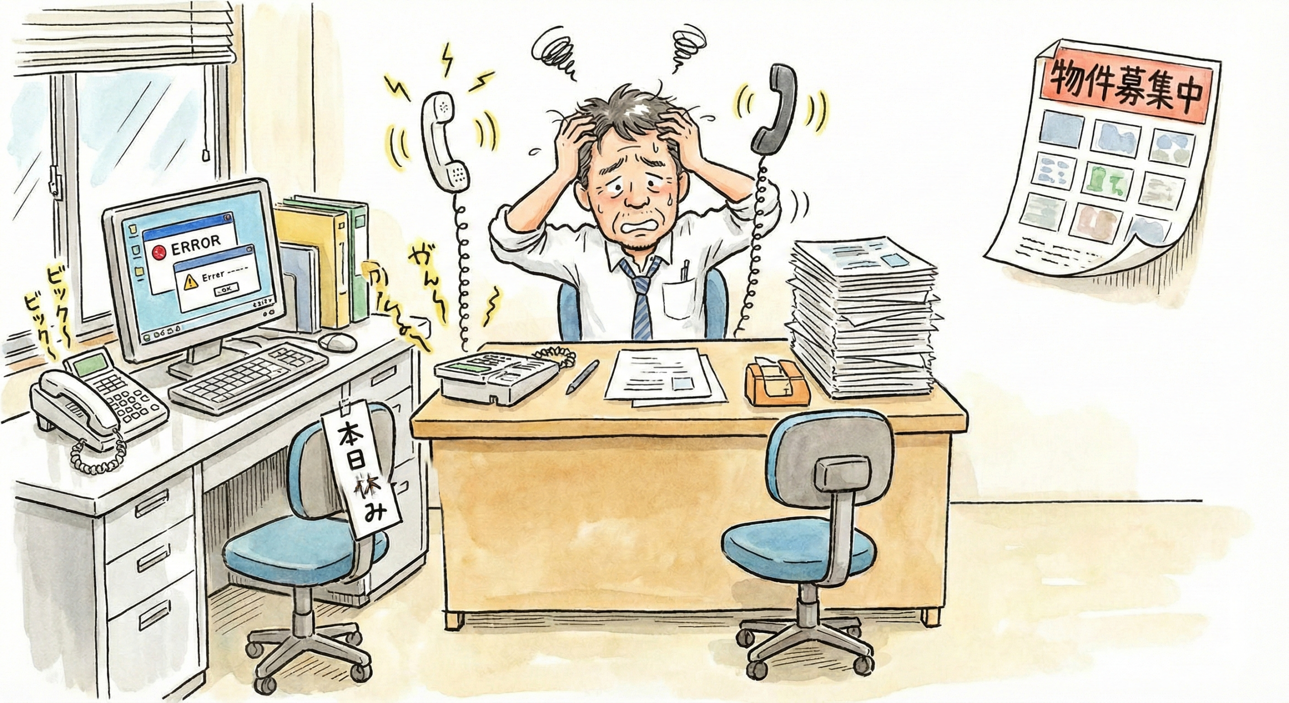 - 事務員さんが急に休んで、入稿が止まった